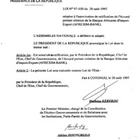 - Loi N° 97-030 du 20 août 1997 Loi relative à l’autorisation de ratification de l’accord portant création de la Banque Africaine d’import-export (AFREXIM-BANK)