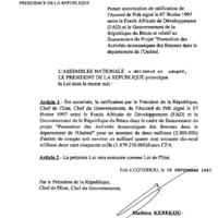 - Loi N° 97-041 du 10 septembre 1997 portant autorisation de ratification de l’accord de prêt signé le 07 février 1996 entre le Fonds africain de développement (FAD) et le gouvernement de la République du Bénin relatif au financement du projet « Promotion des activités économique des femmes dans le département de l’Ouémé »