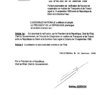 - Loi N° 98-002 du 16 janvier 1998 autorisant la ratification de l’accord de coopération en matière de transports et de transit signé le 13 septembre 1990 entre la République du Bénin et le Burkina Faso