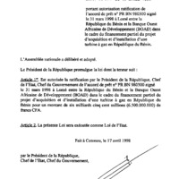 - Loi N° 98-014 du 17 avril 1998 portant autorisation de ratification de l’accord de prêt n° PR BN 98 03 00 signé le 31 mars 1998 à Lomé entre la République du Bénin et la Banque Ouest Africaine de Développement (BOAD) dans le cadre du financement partiel du projet d’acquisition et d’installation d’une turbine à gaz en République du Bénin
