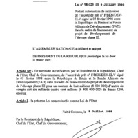 - Loi N° 98-023 du 9 juillet 1998 portant autorisation de ratification de l’accord de prêt n° F/BEN/ DEV-ELV signé le 05 février 1998 entre la République du Bénin et le Fonds Africain de Développement (FAD) dans le cadre du financement du projet de développement de l’élevage phase III