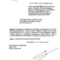- Loi N° 98-024 du 30 juillet 1998 Portant autorisation de ratification de l’accord de prêt signé le 12 novembre 1997 entre la République du Bénin et la Banque Arabe pour le Développement Economique en Afrique (BADEA) relatif au financement partiel du projet d’aménagement hydroagricole de la basse vallée du Mono