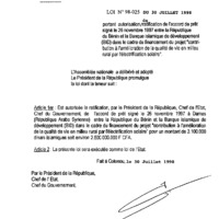 - Loi N° 98-025 du 30 juillet 1998 Portant autorisation de ratification de l’accord de prêt signé le 26 novembre 1997 entre la République du Bénin et la Banque Islamique de Développement (BID) relatif au financement du projet « contribution à l’amélioration de la qualité de vie en milieu rural par l’électrification solaire »