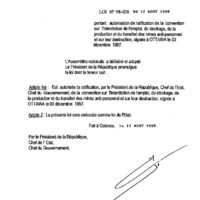 - Loi N° 98-026 du 17 août 1998 portant autorisation de ratification de la Convocation sur l’interdiction de l’emploi, du stockage, de la production et du transfert des mines antipersonnel et sur leur destruction, signée à Ottawa le 3 décembre 1997