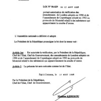 - Loi N° 98-029 du 17 août 1998 portant autorisation de ratification des amendements de Londres adoptés en 1990 et de l’amendement de Copenhague adopté en 1992 au protocole de Montréal relatif à des substances qui appauvrissent la couche d’ozone