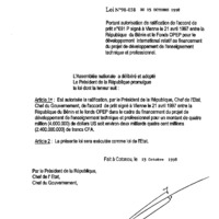 - Loi N° 98-038 du 15 octobre 1998 portant autorisation de ratification de l’accord de prêt n° 691 P signé à Vienne le 21 Avril 1997 entre le Fonds OPEP pour le Développement International et la République du Bénin relatif au financement du projet de développement de l’enseignement technique et professionnel
