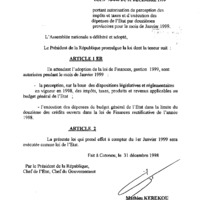 - Loi N° 98-040 du 31 décembre 1998 portant autorisation de perception des impôts et taxes et d’exécution des dépenses de l’Etat par douzième provisoires pour le mois de janvier 1999