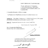 - Loi N° 2000-02 du 27 janvier 2000 portant ratification de l’Ordonnance n° 2000-002 du 02 janvier 2000 portant Programme d’investissements publics pour la gestion 2000.