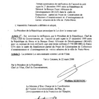 - Loi N° 2000-05 du 22 mars 2000 portant autorisation de ratification de l’accord de prêt signé le 27 décembre 1999 entre la République du Bénin et la Banque Ouest Africaine de Développement (BOAD) dans le cadre du financement partiel du projet de construction de collecteurs d’assainissement et d’aménagement de voiries urbaines de la Ville de Porto-Novo.