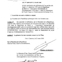 - Loi n° 2000-06 du 22 mars 2000 portant autorisation de ratification de l’accord de prêt signé le 30 décembre 1999 entre la République du Bénin et l’Association Internationale de Développement (AID) dans le cadre du financement du projet d’appui au développement du secteur privé.