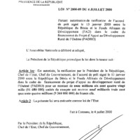 - Loi n° 2000-09 du 4 juillet 2000 portant autorisation de ratification de l’accord de prêt signé le 13 janvier 2000 entre la République du Bénin et le Fonds Africain de Développement (FAD) dans le cadre du financement du projet d’appui au développement rural de l’Ouémé.