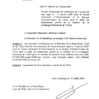 - Loi n° 2000-14 du 17 juillet 2000 portant autorisation de ratification de l’accord de prêt signé le 13 janvier 2000 entre la Caisse autonome d’amortissement du Bénin et la Banque d’Import—Export de Chine dans le cadre du financement partiel de la création de la compagnie béninoise de textile.