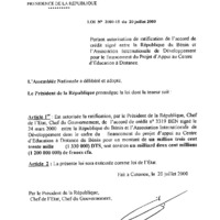 - Loi n° 2000-15 du 20 juillet 2000 portant autorisation de ratification de l’accord de crédit signé entre la République du Bénin et l’Association Internationale de Développement (AID) pour le financement du projet d’appui au centre d'Education à distance (CED).