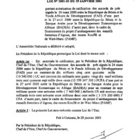 - Loi n° 2001-02 du 29 janvier 2001 portant autorisation de ratification des accords de prêt signés le 24 mars 2000 entre la République du Bénin et le Fonds Africain de Développement (FAD) d’une part et le 27 avril 2000 entre la République du Bénin et la banque Arabe pour le Développement Economique en Afrique (BADEA) d’autre part, dans le cadre du financement du projet d’aménagement des massifs forestiers d’Agoua, des monts Kouffé et de Wari-Maro.