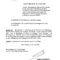 - Loi n° 2001-04 du 26 avril 2001 portant autorisation de ratification de l’accord de prêt signé entre la République du Bénin et la Banque Ouest Africaine de Développement dans le cadre du financement partiel du programme de développement des plantes à racines et tubercules (PDRT).