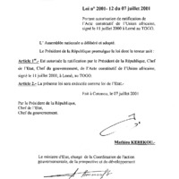 - Loi n° 2001-12 du 7 juillet 2001 portant autorisation de ratification de l’Acte constitutif de l’Union Africaine signé le 11 juillet 2000 à Lomé au Togo.