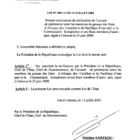 - Loi n° 2001-13 du 13 juillet 2001 portant autorisation de ratification de l’accord de partenariat entre les membres du groupe des États d'Afrique, des Caraïbes et du pacifique d'une part et la Communauté Européenne et ses Etats membres d’autre part, signé à Cotonou le 23/06/2001.