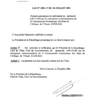 - Loi n° 2001-17 du 20 juillet 2001 portant autorisation de ratification du protocole A/P1/11/84 sur les entreprises communautaires de la Communauté Economique des Etats de l’Afrique de l’Ouest (CEDEAO).