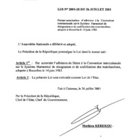 - Loi n° 2001-20 du 26 juillet 2001 portant autorisation d’adhésion à la Convention Internationale sur le système harmonisé de désignation et de codification des marchandises adoptée à Bruxelles, le 14 juin 1983.