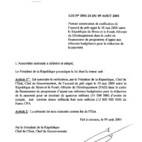 - Loi n° 2001-24 du 9 août 2001 portant autorisation de ratification de l’accord de prêt signé le 30 mai 2001 entre la République du Bénin et le Fonds Africain de Développement (FAD) dans le cadre du financement du programme d’appui aux réformes budgétaires pour la réduction de la pauvreté.