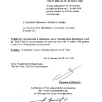 - Loi n° 2001-26 du 9 août 2001 portant autorisation de ratification du Statut de Rome du 17 juillet 1998 portant création de la Cour pénale internationale.