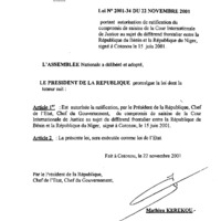 - Loi n° 2001-34 du 22 novembre 2001 portant autorisation de ratification du compromis de saisine de la Cour Internationale de Justice au sujet du différend frontalier entre la République du Bénin et la République du Niger signé à Cotonou, le 15 juin 2001.
