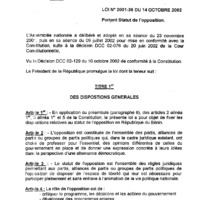 Loi n° 2001-36 du 24 octobre 2002 portant statut de l’opposition