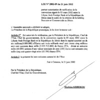 - Loi n° 2002-09 du 21 juin 2002 portant autorisation de ratification de la convention signée le 03 mars 2002 entre la Libyan Arab Foreign Bank et la République du Bénin dans le cadre de la création de la Holding bancaire et commerciale du Bénin