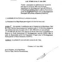 - Loi n° 2002-10 du 21 juin 2002 portant autorisation de ratification de l’accord de prêt signé le 20 février 2002 entre la République du Bénin et le Fonds International de Développement Agricole (FIDA) dans le cadre du financement partiel du programme d’appui pour le développement participatif de la pêche artisanale (PADPPA).