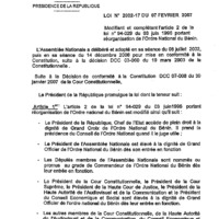 - Loi n° 2002-17 du 7 février 2007 portant modification de l’article 2 de la loi n° 94-029 du 03 juin 1996 portant réorganisation de l’ordre national du Bénin.