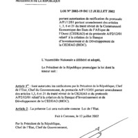 - Loi n° 2002-19 du 12 juillet 2002 portant autorisation de ratification du protocole A/P1/12/01 portant amendement des articles 1, 3, 6 et 21 du Traité révisé de la Communauté économique des Etats de l'Afrique de l'Ouest (CEDEAO) et du Protocole A/P2/12/01 relatif à la création de la banque d'investissement et de développement de la CEDEAO (BIDC).