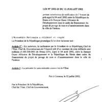 - Loi n° 2002-20 du 12 juillet 2002 portant autorisation de ratification de l’accord de prêt signé le 04 avril 2002 entre la République du Bénin et la Banque Ouest Africaine de Développement (BOAD) dans le cadre du financement du projet de pavage de rues et d’assainissement dans la ville de Parakou.