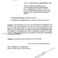 - Loi n° 2002-23 du 23 septembre 2002 portant autorisation de ratification de l’accord de prêt signé le 21 décembre 2001 entre la République du Bénin et le Fonds Africain de Développement (FAD) dans le cadre du financement du projet de bois de feu phase II (PBF – II)