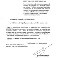 - Loi n° 2002-27 du 31 décembre 2002 portant autorisation de ratification du protocole facultatif se rapportant à la convention relative aux droits de l’enfant et concernant l’implication d’enfants dans les conflits armés et du protocole facultatif se rapportant à la convention relative aux droits de l’enfant et concernant la vente d’enfants, la prostitution et la pornographie mettant en scène des enfants
