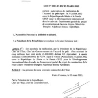 - Loi n° 2003-05 du 5 mars 2003 portant autorisation de ratification de l’accord de prêt signé le 31 juillet 2002 entre la République du Bénin et le Fonds OPEP pour le développement International dans le cadre du financement partiel du projet de construction de la route Akpro-Missérété-Dangbo-Adjohoun-Bonou-Kpédékpo.