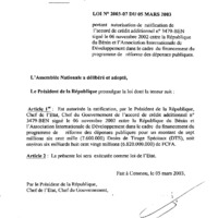 - Loi n° 2003-07 du 5 mars 2003 portant autorisation de ratification de l’accord de crédit additionnel n° 3479-BEN signé le 06 novembre 2002 entre la République du Bénin et l’Association Internationale de Développement dans le cadre du financement du programme de réforme des dépenses publiques