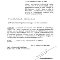 - Loi n° 2003-09 du 10 mars 2003 portant autorisation de ratification de l’accord de prêt signé le 23 décembre 2002 entre la République du Bénin et le Fonds Africain de Développement (FAD) dans le cadre du financement complémentaire du Programme d’Appui au Développement Participatif de la Pêche Artisanale (PADPPA).
