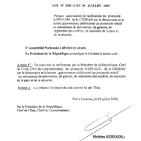 - Loi n° 2003-11 du 9 juillet 2003 portant autorisation de ratification du protocole additionnel A/SP1/12/01 de la CEDEAO sur la Démocratie et la Bonne gouvernance, au protocole relatif au mécanisme de prévention, de gestion, de règlement des conflits, de maintien de la paix et de la sécurité.