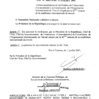 - Loi n° 2003-14 du 11 juillet 2003 portant autorisation de ratification de l’instrument d’amendement à la Constitution de l’Organisation Internationale du Travail adopté par la 85ème session de la Conférence internationale du travail.
