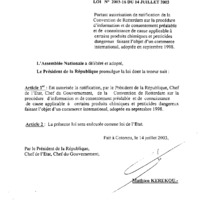 - Loi n° 2003-16 du 14 juillet 2003 portant autorisation de ratification de la Convention de Rotterdam sur la procédure d’information et de consentement préalable et de connaissance de cause applicable à certains produits chimiques et pesticides dangereux faisant l’objet d’un commerce international, adopté en septembre 1998.