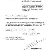 - Loi n° 2004-02 du 11 février 2004 portant autorisation de ratification de l’Acte Constitutif de la Conférence des Ministres de l’Agriculture de l’Afrique de l’Ouest et du Centre (CMA/AOC) adopté à Yaoundé le 16 février 1996.