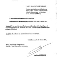 - Loi N° 2004-05 du 23 février 2004 portant autorisation de ratification du traité portant création du parlement de l’Union Economique Monétaire ouest Africaine (UEMOA)