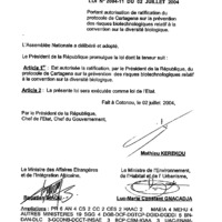 - Loi n° 2004-11 du 30 juin 2004 portant autorisation de ratification du protocole de cartagena sur la prévention des risques biotechnologiques relatif à la convention sur la diversité biologique