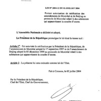 - Loi n° 2004-12 du 30 juin 2004 portant autorisation de ratification des amendements de Montréal et de Beijing au protocole de Montréal relatif à des substances qui appauvrissent la couche d’ozone