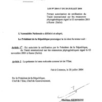 - Loi n° 2004-17 du 12 juillet 2004 portant autorisation de ratification du traité international sur les ressources phytogénétiques signé le 03 novembre 2001 à Rome (Italie).