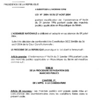 - Loi n° 2004-18 du 12 juillet 2004 portant modification de l’ordonnance n°96-04 du 31 janvier 1996 portant code des marchés publics en République du Bénin.